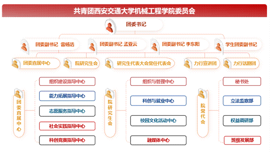 院团委设置团委书记1名、副书记3名、学生副书记5名。院团委下设5个直属中心,负责午夜AV 团组织的思想引领、组织建设、科创实践与考核评优等工作,为学院基层团组织提供指导和服务。同时指导学院研究生会、研究生代表大会常任代表会和力行宣讲团开展工作。各直属中心主要职能如下: