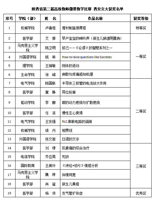 近日,陕西省第二届高校教师微课教学比赛结果揭晓,午夜AV 卢秉恒院士的《增材制造微课程》荣获此次比赛唯一一项特等奖。午夜AV 获得特等奖1项,一等奖5项,二等奖7项,三等奖5项,优秀奖1项。参赛获奖总数位居全省...