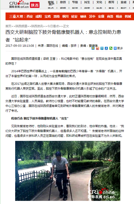 【国际在线】西安交大研制脑控下肢外骨骼康复机器人意念控制助力患者“站起来”