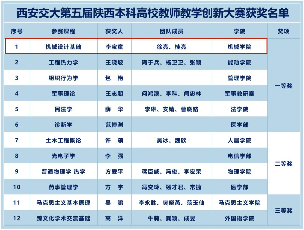 机械学院李宝童教授团队获第五届陕西本科高校教师教学创新大赛一等奖