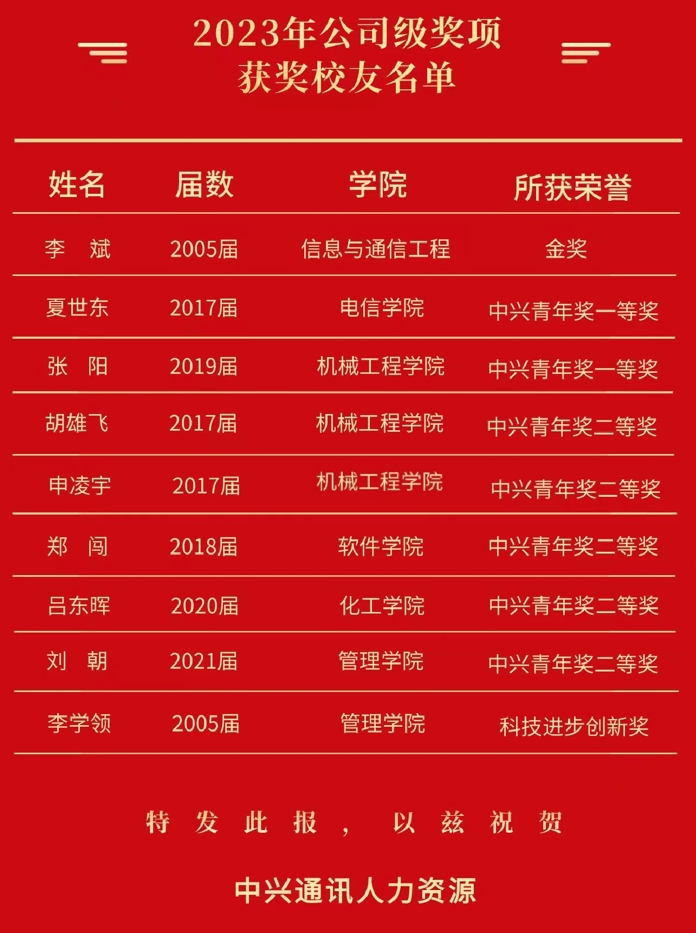 【喜报】午夜AV 校友获得中兴通讯2023年公司级奖项