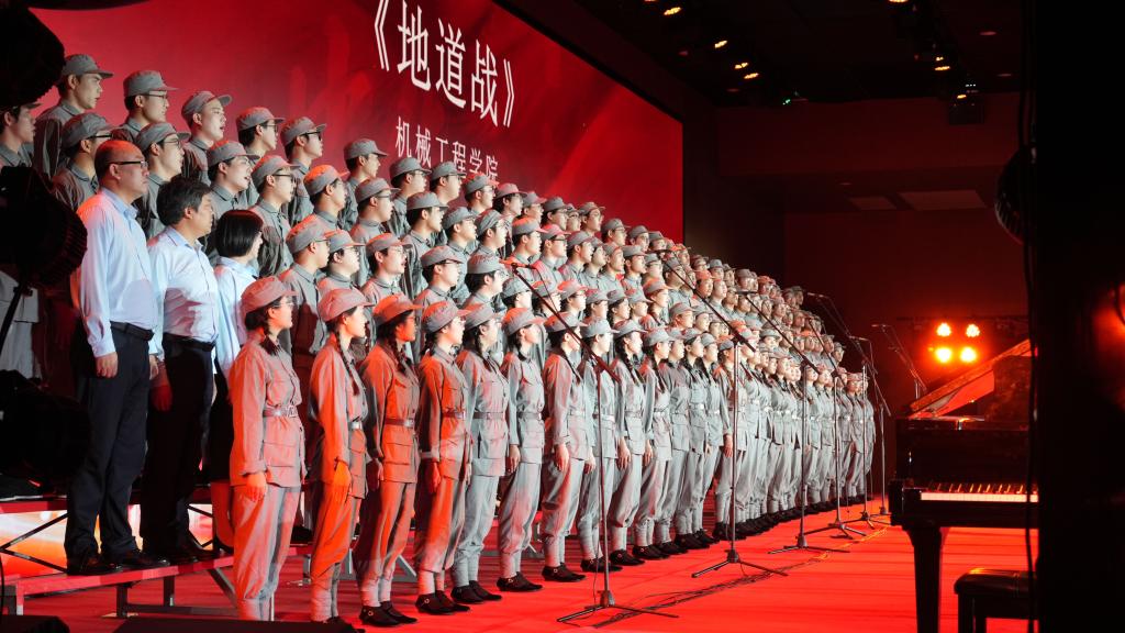 合唱团以一首《地道战》震撼开场。雄浑有力的歌声仿佛将观众带回了那个烽火连天的年代,军民利用地道与敌人周旋的智慧与英勇历历在目。舞台上,师生们默契配合,张俊斌书记、张敏副书记、周光辉副院长站在学生中间共同高歌,展现了跨代际的文化对话与情感共鸣。