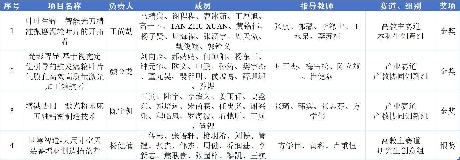 “光影智导——基于视觉定位引导的航发涡轮叶片气膜孔高效高质量激光加工领航者”、“增减协同——激光粉末床五轴精密制造技术”2个项目获国家金奖。
