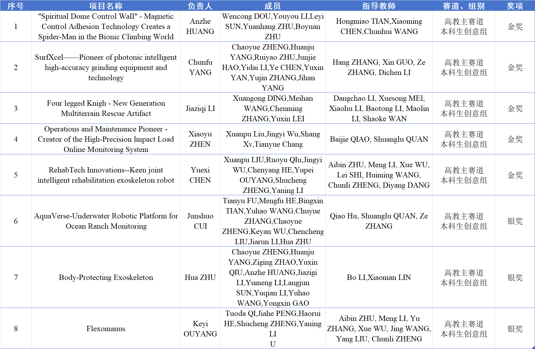 参赛学子披荆斩棘,不负众望,分别荣获金奖3项,银奖1项,国际项目金奖5项,银奖3项。其中,主体赛金奖1项、银奖1项;产业赛道金奖2项。机械学子以先锋姿态,在科研创新和创业实践的广阔天地中奋勇开拓,展现了新时代青年肩负历史使命、引领未来发展的非凡潜力和责任担当。