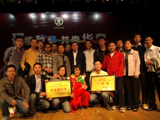 代表队由2010级的126名研究生组成,指挥郝婕,领唱张微,机械学院党委副书记訾艳阳、工会主席王朝辉、院办主任王收阁出席并参加了本次演出,凭借一曲《今天是你的生日,我的中国》赢得了满场观众的热烈掌声, 抒情豪迈的演唱,加上腰鼓队的激情舞蹈,使整个演出精彩纷呈。经过在场专业评委们的评审, 最终,以9.842分的最高成绩荣获了本次比赛的冠军.