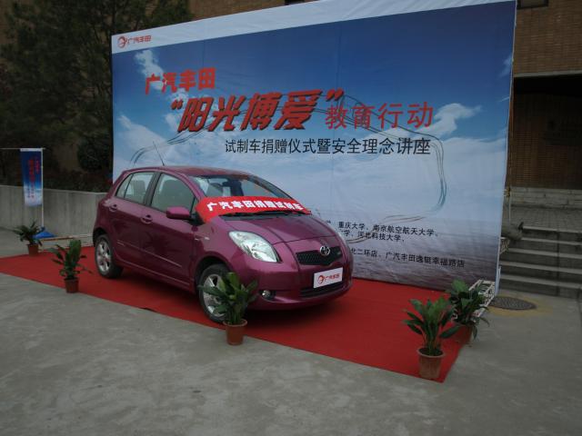 、重庆大学、南京航空航天大学、燕山大学、长安大学等十所高校捐赠试制车,捐赠仪式在科学馆举办,本广汽本田综合管理部张华部长、研究开发中心谭为科长、机械学院常务副院长高建民教授、以及南京航空航天大学、燕山大学、长安大学等十所高校学院院长以及研究生代表100余人参加了捐赠仪式。