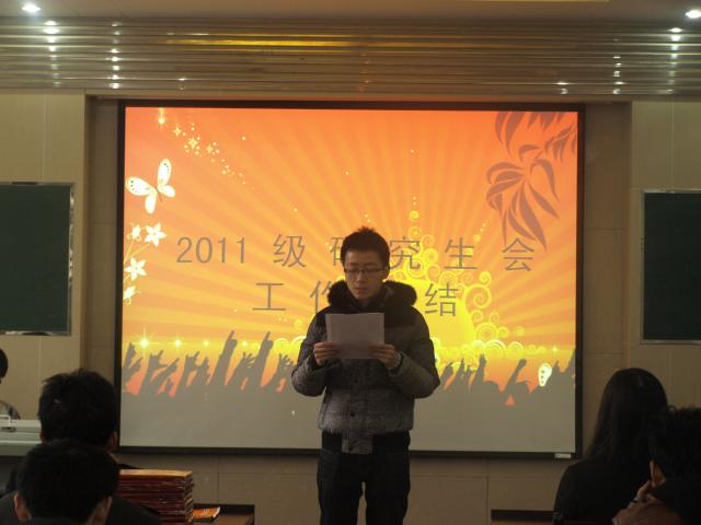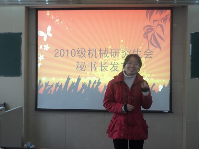 接下来,由2010届研究生会秘书长徐铭同学做总结汇报。她对于如何平衡学生工作和学习科研提出了自己的观点,认为只有承受住更多的挑战才会有成果。同时建议大家要有广阔的空间,在工作时应努力提高效率并持之以恒,正确对待对待学习和工作,全方位发展自己。