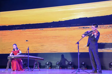 悠扬古朴的古筝和舒缓的小提琴,吴尚子和杨峥合奏的《渔舟唱晚》,呈现给现场观众一幅夕阳中,渔夫满载丰收的喜悦欢乐情景。