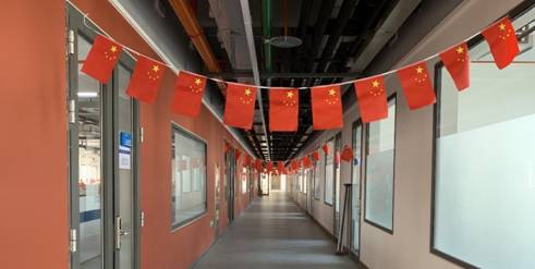 创新港入驻元年,恰逢欢庆中华人民共和国成立70周年华诞之际。设计科学与基础部件研究所(简称“设计所”)用飘扬的国旗祝福祖国母亲,并借此开展爱国奋斗教育活动,组织学生在线观看“庆祝中华人民共和国成立70周年主题巡展”、阅读“最美奋斗者”相关资料。位于创新港二号巨构的设计所工作区,楼道挂满了一面面国旗,每一个教师办公室门口和研究生工位上也都插满了国旗。放眼望去,国旗飘飘,设计所有一种红,叫“我爱你,中国!”飘扬的国旗,带领我们一起启航。