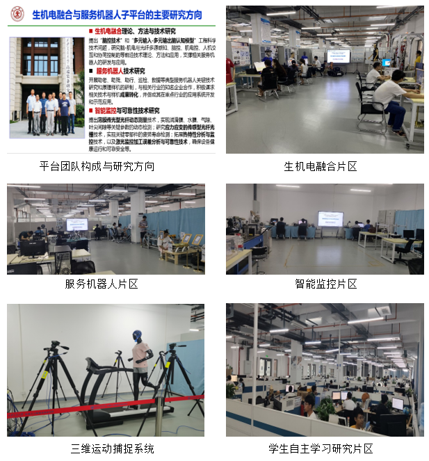 “生机电融合与服务机器人研究子平台”是中国西部科技创新港高端装备研究院机器人与智能系统研究平台的重要组成部分,经过半年多的建设,现已初步建成投入运行。该子平台主要包括生机电融合、服务机器人和智能监控等三大区块,涵盖了生机电融合与服务机器人团队在负责人张小栋教授带领下,徐海波、张英杰教授,朱爱斌、史晓军、张政、王晶副教授,以及张东升博士等8位教师于国内较早开展的“脑控技术”、“外骨骼机器人”和“光纤动态测量”等前沿领域的多项研究成果,涉及机器人的仿生设计、精密感知、人机交互、协同控制等诸多关键技术研究。目前,平台配备的三维运动捕捉系统,以及自主研发的康复训练机器人、脑控假肢、肌电控排爆机器人、齿根应力应变光纤动态测量系统等各类实验设备均已在中国西部科技创新港巨构二号楼2-5149实验室布置完毕并投入正常使用,为团队师生开展前沿技术攻关和工程应用系统开发等研究提供了有力的保障。