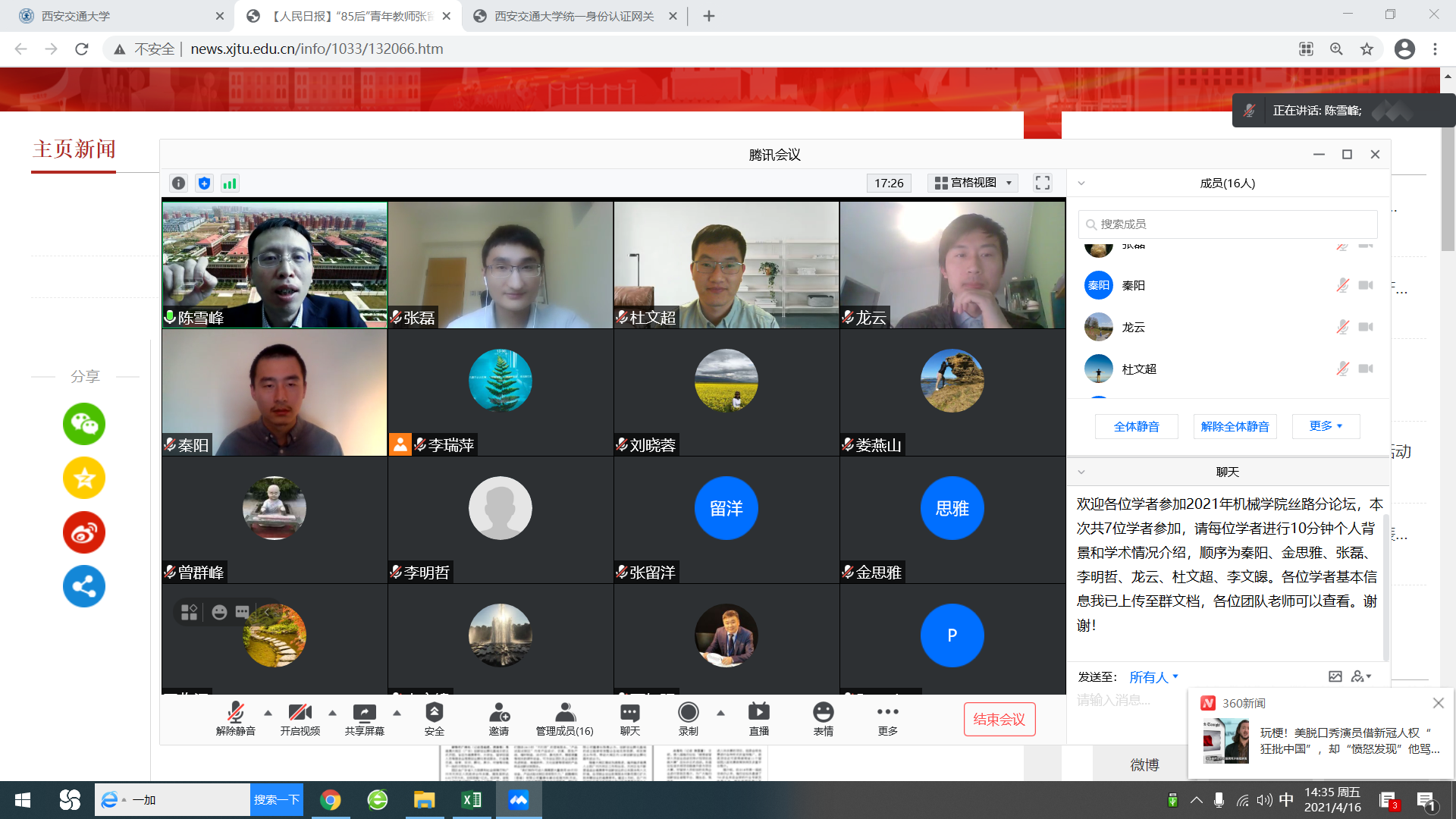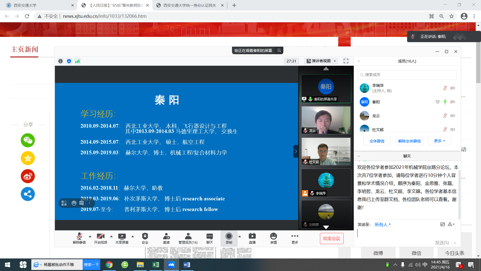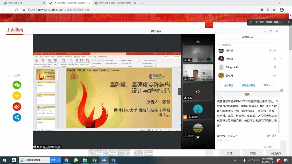 此次参加丝绸之路机械分论坛交流的青年学者来自美国、英国、法国等国家的著名高校及研究院,各位学者就个人背景及学术研究情况进行了介绍,关于复合材料、增材制造、润滑机理等最新前沿科技研究成果隔空传递。各位学者对于学科、工作环境、科研现状、实验设备以及创新港的建设速度和成果赞不绝口,会上咨询了很多关于人才计划的问题,纷纷表示希望学院能够推荐合适的岗位,早日加盟学院。