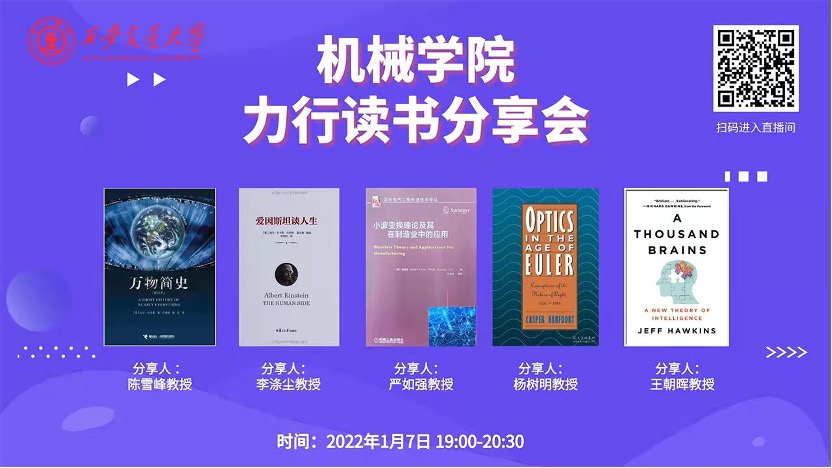 院长陈雪峰教授、机械制造系统工程国家重点实验室主任李涤尘教授、国际机械中心主任严如强教授、副院长杨树明教授和党委书记王朝晖教授依次进行了读书分享,机械学院的本科生以及研究生共3800余人次在线上观看直播学习,党委副书记张敏主持本次分享会。