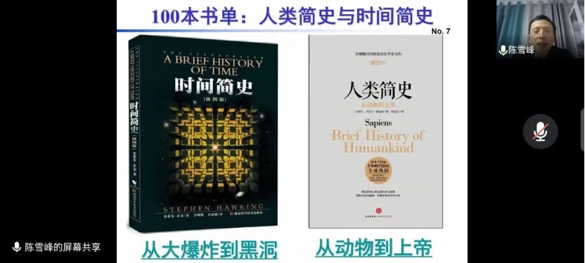 陈雪峰教授分享了比尔·布莱森的《万物简史》一书,他在分享前提到,机械学子一定要多读书、坚持读书,要有选择地读好书,同时也要充分利用现有的场地资源进行读书。陈雪峰教授通过比尔·布莱森的《万物简史》一书中回溯了科学史上那些伟大与奇妙的时刻,并表明科学的进步是一批又一批的科学家前赴后继的结果。陈雪峰教授从《万物简史》这本书引出系统思维的相关概念,希望学生要具有系统思维的能力。陈雪峰教授结合当下的疫情论述了系统思维能力的重要性,同时强调“应急处突”能力的必要性。