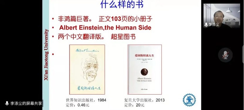 李涤尘教授分享《爱因斯坦谈人生》一书。他指出《爱因斯坦谈人生》一书并非传记,也不阐释爱因斯坦的科学思想,它并非随心所欲编排次序,该书提供的视角为我们补完了伟人的另一面。他从《爱因斯坦谈人生》的主要内容为切入点展开分享,表述本书阐述了爱因斯坦对人生价值、学习和研究、做人做事和观点这几个方面的认知。李涤尘教授指出了目前教学科研领域所存在的问题以及如何改进,希望全体师生能从这本书中得到启发,不断充实丰富自己的人生。