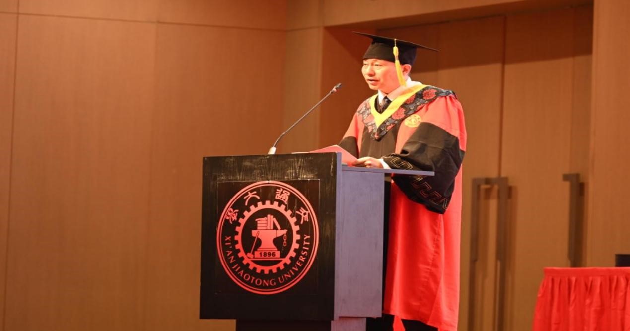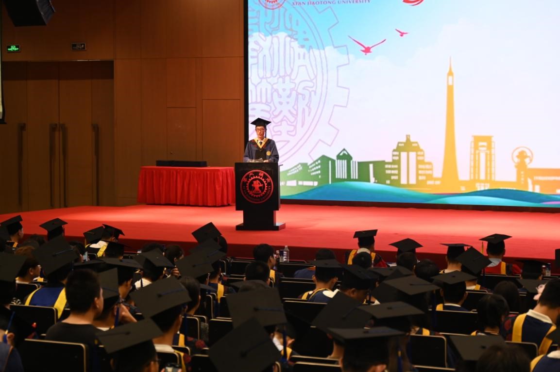 党委书记王朝晖教授为毕业生送上了毕业寄语。王朝晖教授回顾了同学们在交大的求学时光,对同学们的毕业表示祝贺,希望大家鹏程万里、前程似锦。希望同学们带着交大人的光荣与梦想,在时代洪流中抓住机遇,用更深刻的眼光审视自己,以更大的胸怀迎接挑战,继续传承好西迁精神,敢担当、勇作为,做新时代的奋进者,不懈攀登、永不退缩!