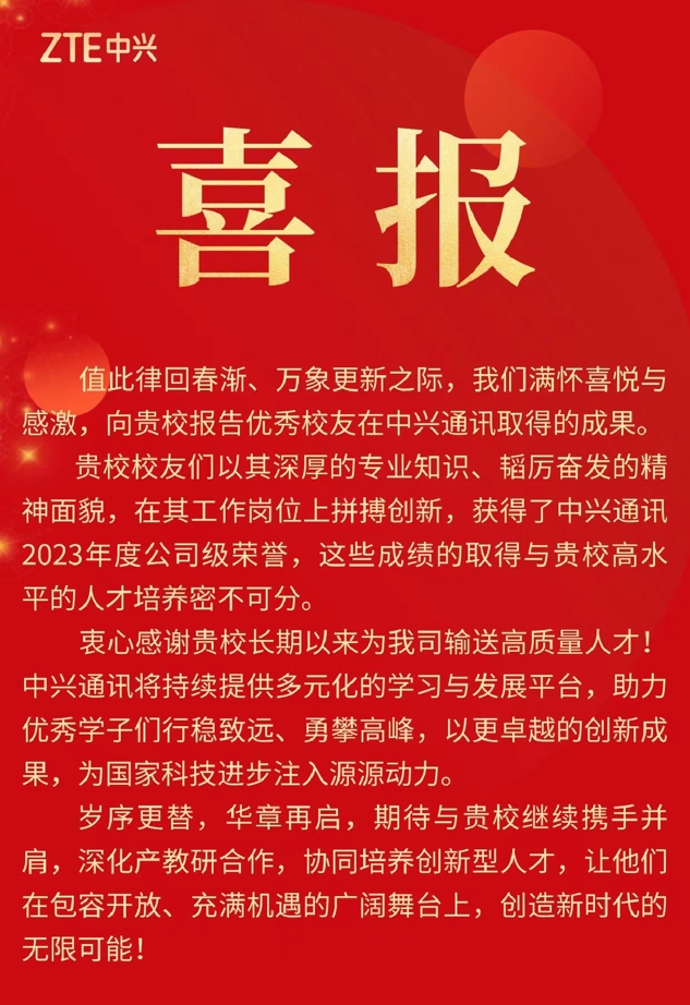 【喜报】午夜AV 校友获得中兴通讯2023年公司级奖项