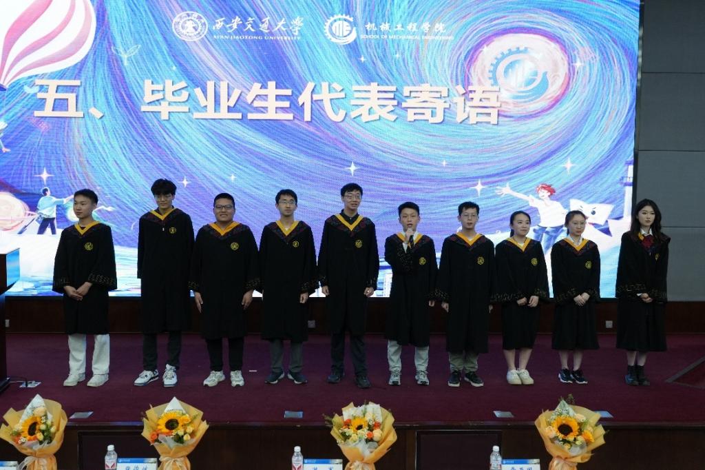 “我从交大机械毕业,融入时代建设洪流。精勤求学、敦笃励志;果毅力行、忠恕任事。在人生新征程中,永远感恩老师教诲、学院培养,饮水思源、知行合一,以梦为马、不负韶华。胸怀‘国之大者’,弘扬西迁精神;勇担国家使命,共创交大荣誉。”全体毕业生以庄重的语言表达对学校和学院的感激与不舍,以昂扬的奋斗姿态迎接人生新篇章、书写新辉煌。欢送会在“交大我爱你”的歌声中圆满结束。