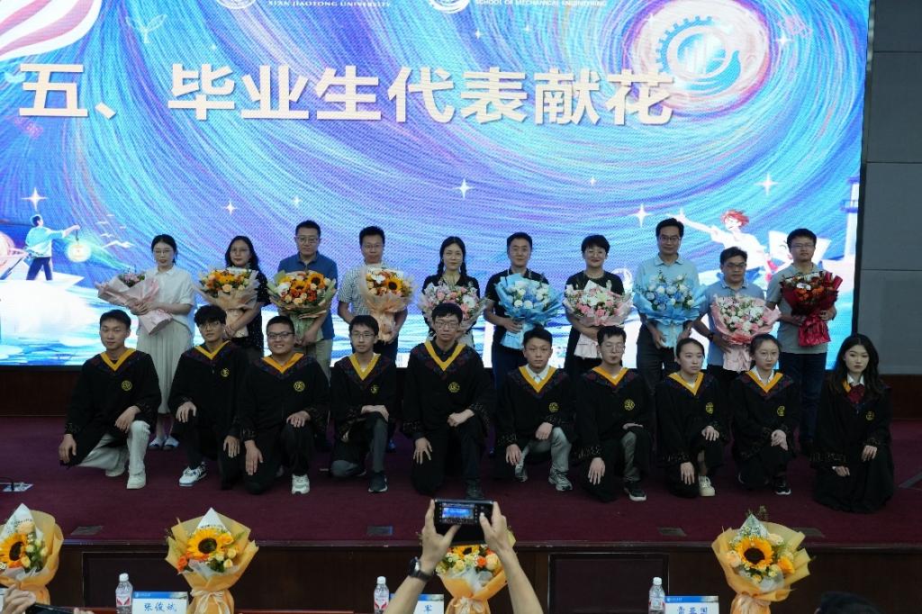 本校读研的3D打印001班马铎、机械003班杨帅、机械001班包翰盟,前往上海交通大学读研的车辆001班张强博,到英国帝国理工学院深造学习的机械002班邱宣筼,作为选调生奔赴河北邯郸的食品测控001班吕义博,前往中核辽宁核电有限公司工作的工设001班孙欣悦,选择到上海正泰智能科技有限公司施展才华的机械004班朱心语,被录取到北京航空航天大学读研的机械006班杨陌涵,到北京大学读研的智造钱001班孙承睿等10名前往各知名学府深造和祖国大地建功立业的毕业生代表为教师代表献花并分享了毕业感悟和对母校母院的祝福。