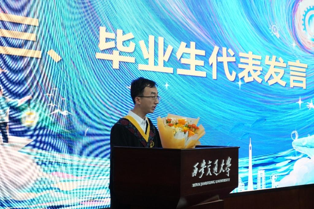 机械004班学生朱一辰作为毕业生代表发言。他回顾了走进机械学院的喜悦激动,分享了在工程制图、机械设计基础等专业课程中的难忘经历和在生产实习、企业实践的宝贵收获。他表示机械学院塑造了同学们的品格、淬炼了专业能力,将永远牢记学院培养、老师教诲,永远以身为机械人、交大人而自豪,永远捍卫机械荣誉和交大荣誉。