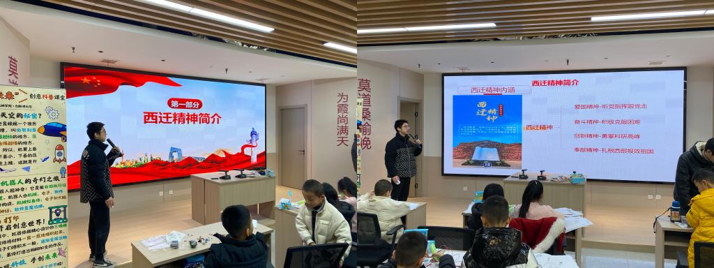 科普环节之后,队员与孩子们一同进行了3D打印与机器人拼装的手工实践环节,激发了他们探索科学的好奇与热情,现场互动气氛高涨。随后,实践队员们带来了西迁精神的宣讲,带领孩子们走进交大西迁的历史故事,感受交大人“听党指挥跟党走”的坚定信仰。