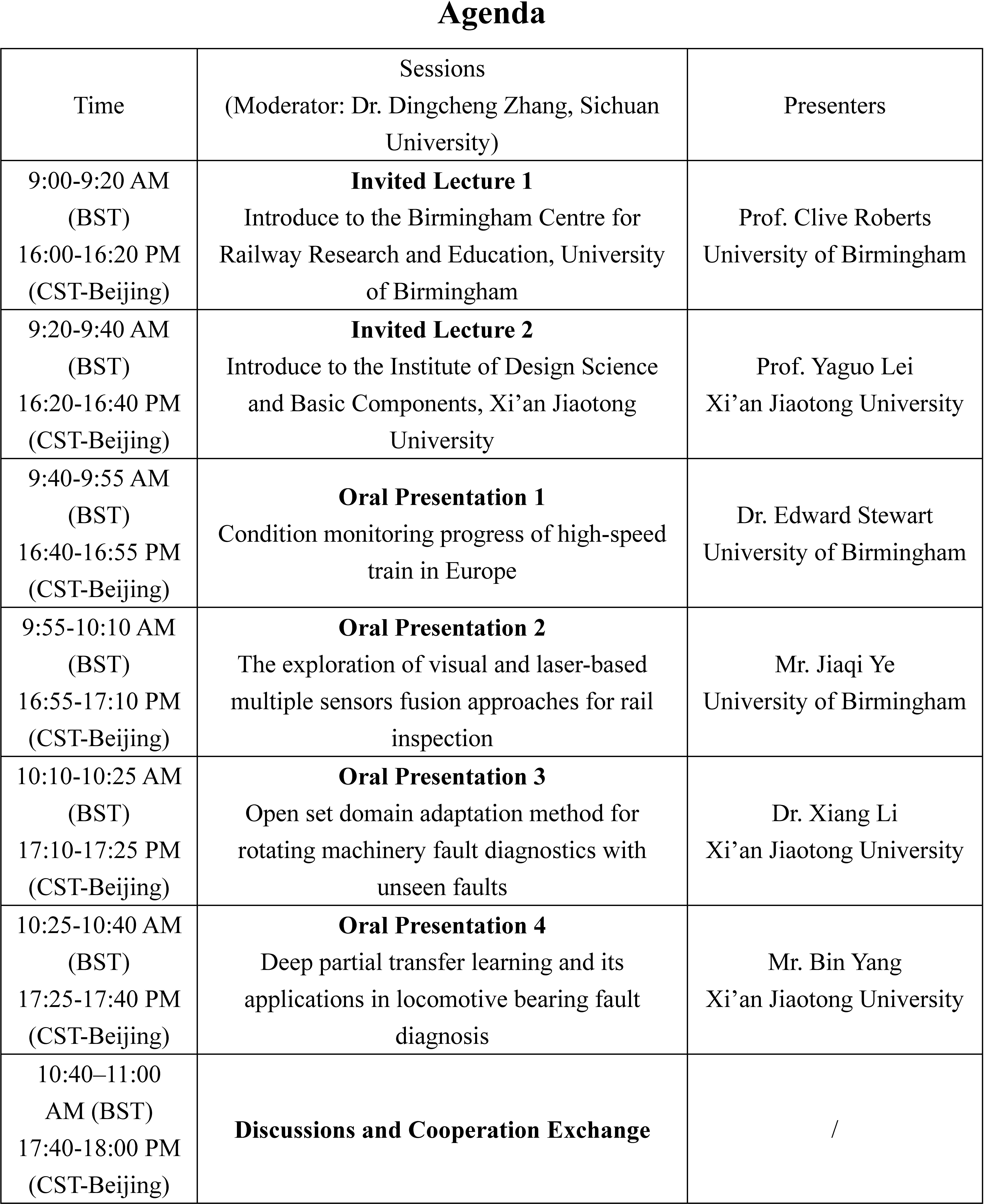 Fault diagnosis and prognostics of railway vehicles are increasingly concerned in UK and China. In both countries, railway transportation systems have achieved exciting achievements around the world. The critical components of railway vehicles, such as wheelset bearings, pantograph, and bogies, are significant for the service of train vehicles. To ensure the safe running of railway vehicles, machine learning theory has presented a powerful ability, especially fueled by deep learning recently. This workshop is organized by Xi’an Jiaotong University and the University of Birmingham and is sponsored by NSFC-RS International Exchanges Scheme (51911530198, IEC\NSFC\181374). The event will discuss and exchange information and knowledge of XJTU and UoB in areas of intelligent fault diagnosis and prognostics of railway vehicles. Besides, it is also open to other researchers who are interested in the relevant topics. Due to the Covid-19 pandemic, this workshop will be held online (virtual conference).