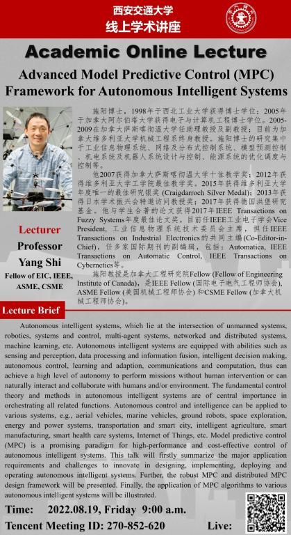 Biography: Yang SHIreceived the Ph.D. degree in electrical and computer engineering from the University of Alberta, Edmonton, AB, Canada, in 2005. From 2005 to 2009, he was an Assistant Professor and Associate Professor in the Department of Mechanical Engineering, University of Saskatchewan, Saskatoon, Saskatchewan, Canada. In 2009, he joined the University of Victoria, and now he is a Professor in the Department of Mechanical Engineering, University of Victoria, Victoria, British Columbia, Canada. His current research interests include networked and distributed systems, model predictive control (MPC), cyber-physical systems (CPS), robotics and mechatronics, navigation and control of autonomous systems (AUV and UAV), and energy system applications.