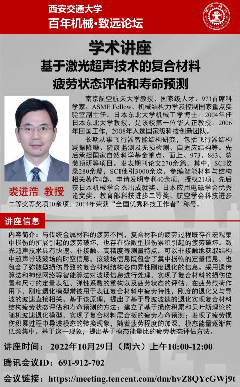 讲座题目:基于激光超声技术的复合材料疲劳状态评估和寿命预测