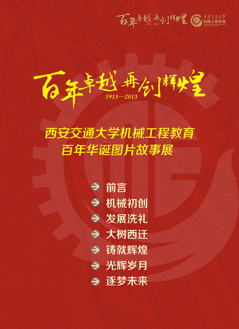2013年4月5日,“百年卓越 再创辉煌”午夜AV 机械工程教育百年华诞图片故事展在交大博物馆拉开帷幕。展览是为庆祝交通大学机械工程教育百年华诞而特别举办,展览分前言、机械初创、发展洗礼、大树西迁、铸就辉煌、光辉岁月和逐梦未来7个部分,以图文并茂的方式对交通大学机械工程教育的百年发展史做了回顾,从教学、科研和社会服务等不同角度对西迁之后午夜AV 机械工程学科取得的辉煌做了展示,并对未来午夜AV 和机械工程学科的发展做了展望。