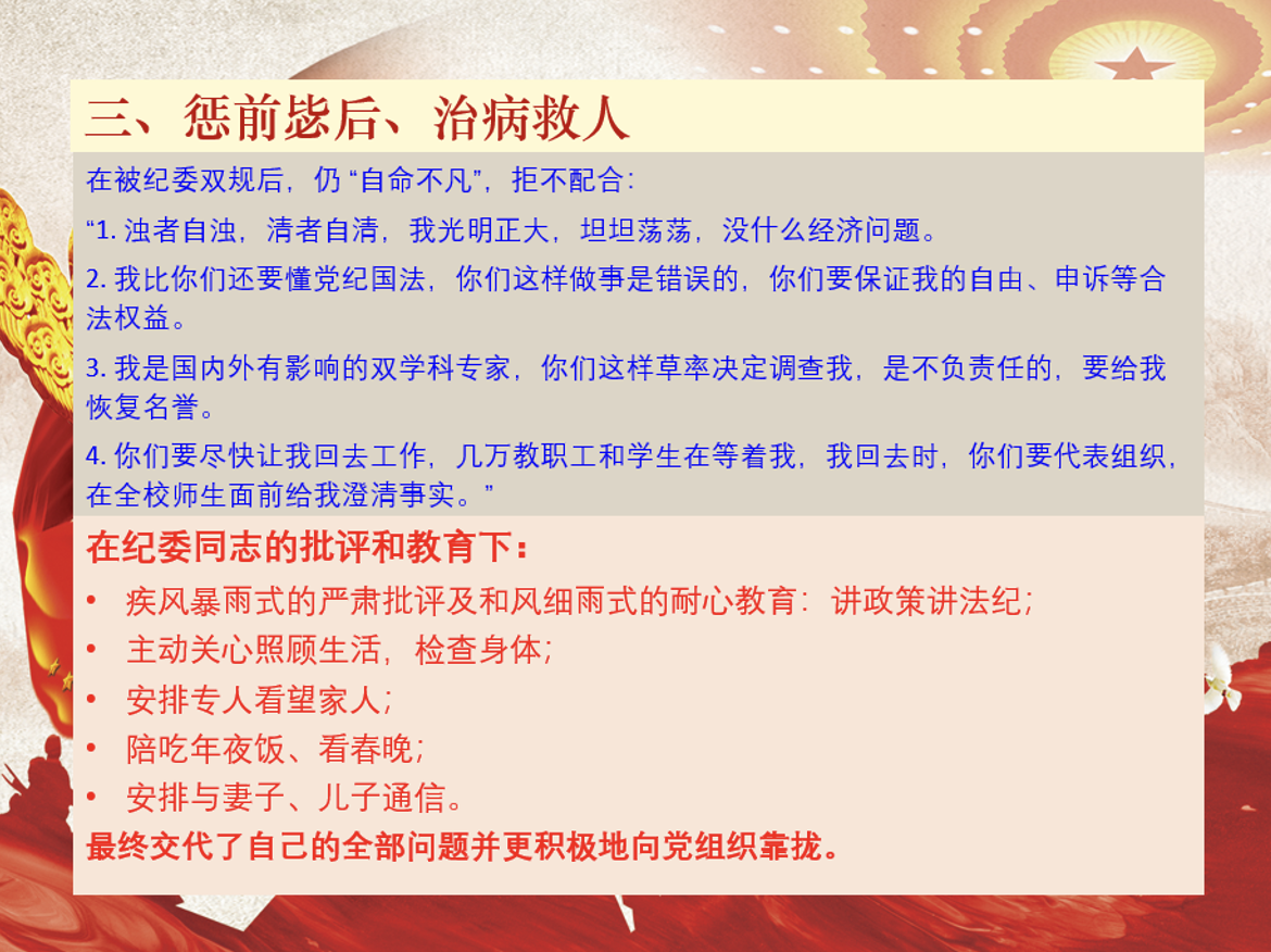 在被双规之后,当事人仍心存侥幸、拒不交代。纪委同志秉持“惩前毖后、治病救人”的原则,对其进行了严肃批评和耐心的教育,对其身体和家人提供了无微不至的照顾,终于让其放下自己内心的防线,逐步交代了自己的全部问题。在双规期间,认清楚自己错误的当事人依然坚持读书、写作、做学问;对“相信组织、依靠组织”有了更加深刻的认知,对于修补自己灵魂里的裂缝有了更坚定的信心。