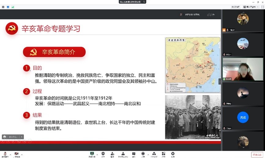 张梦娇同志以“学习辛亥革命,传承奋斗基因”为主题,从“辛亥革命的背景”、“辛亥革命的目的、过程、结果、思想、精神、意义”和“辛亥革命的局限性”三个方面,带领支部同志们重温了辛亥革命的相关历史和精神。