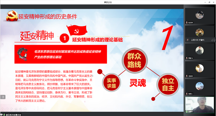 翟鲁彬同志以“赓续红色血脉,弘扬延安精神”为主题,从“延安精神形成的历史条件”、“延安精神的原生形态和主要内容”、“延安精神的时代价值”、“让延安精神放射出新的时代光芒”四个方面,带领支部同志们重温了延安时期老一辈革命家和共产党人留下的光荣传统和优良作风。并通过观看学习视频《踏上新征程 向着新的奋斗目标出发——习近平总书记在瞻仰延安革命纪念地时的重要讲话引发强烈反响》,支部同志们进一步贯彻了伟大建党精神和延安精神。