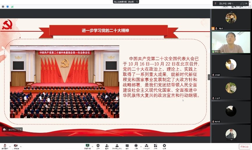 李维一同志以“领悟二十大精神,勇担新时代使命”为题,从“深刻认识党的二十大的重大现实意义和深远历史意义”、“牢牢把握过去5年工作和新时代10年伟大变革的重大意义”、“牢牢把握习近平新时代中国特色社会主义思想的世界观和方法论”、“牢牢把握以中国式现代化推进中华民族伟大复兴的使命任务”、“牢牢把握以伟大自我革命引领伟大社会革命的重要要求”、“牢牢把握团结奋斗的时代要求”六个方面,带领支部同志们继续学习领悟了二十大精神。并通过观看学习视频《如何学习贯彻党的二十大精神?习近平强调“五个牢牢把握”》,支部同志们进一步贯彻了二十大精神。