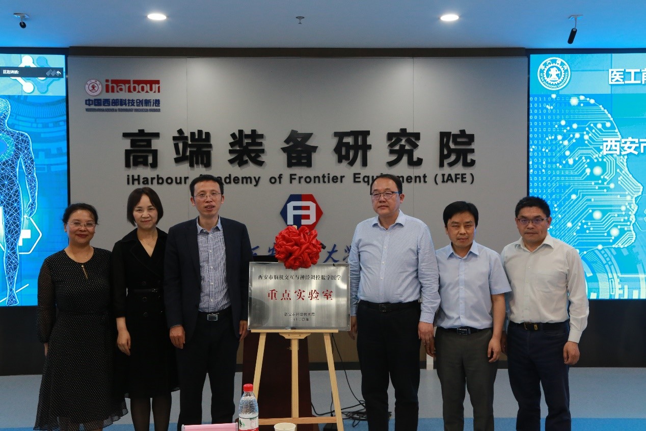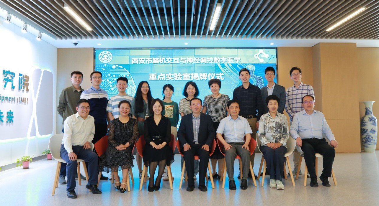 、空军军医大学和西安市第一医院联合申请成立,揭牌仪式由医工交叉研究所党支部书记陶唐飞主持,高端装备研究院院长陈雪峰发表致辞,医工交叉研究所学术带头人、西安市脑机交互与神经调控数字医学重点实验室主任徐光华教授介绍实验室情况,空军军医大学西京医院康复科主任袁华、西安市第一医院神经内科主任吴松笛、西安市第一医院眼科医疗美容门诊部主任郅瑛同陈雪峰院长、徐光华教授、陶唐飞书记共同揭牌,陈雪峰院长为两家联合单位授牌。