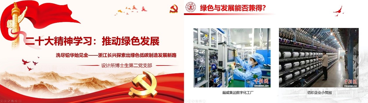 同时,在浙江长兴出差的设计所博士生第二党支部书记刘晓飞同志结合出差所在地长兴县的发展致富之路,向大家分享了长兴的超威集团数字工厂和纺织企业小微园两家企业兼顾环境与经济协调发展的现实案例。长兴县以铅蓄电池及纺织等传统行业为经济支撑,从十几年前的“低小散、重污染”的制造方式转变为高新技术齐聚的数字化生产企业。通过“关停淘汰一批,集聚入园一批,规范提升一批”等方式开展专项整治,让环保倒逼企业生产质量和管理水平的提升。经过十余年的发展,长兴县以跻身全国百强县50强的行列,从最初的“省级环境保护重点监管区”到如今的“重金属污染防治示范区”,头顶上“帽子”的变化使长兴在产业转型上实现华丽转身,并获得“中国电池产业之都”等荣誉称号。2021年长兴县地区生产总值突破800亿元,真正地实现了绿色与发展兼得。