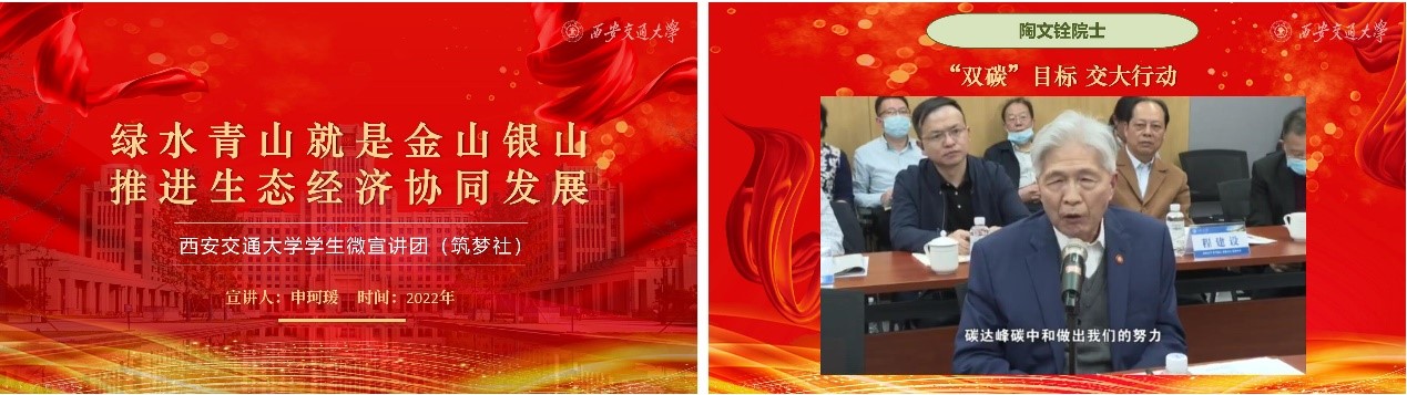 二十大报告中针对未来生态经济保护的方式提出要推动绿色发展,促进人与自然和谐发展。宣讲团申珂瑗同志以遂宁和米脂县高西沟村作为绿色生态发展的区域榜样为支部成员解读生态文明与经济建设的和谐发展之路,列举了西安交大的巨构屋顶绿化建设项目、无干扰地热供热项目和以陶文铨教授为代表的一众科研人员在化学分子和能源科学方面的研究成。充分展示了我校为绿色发展理念持续输出的科研创新动力,为按期完成碳达峰和碳中和的目标一直在努力。