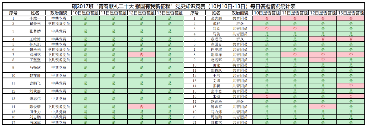 为深入学习贯彻习近平新时代中国特色社会主义思想,全面贯彻党的十九大和十九届历次全会精神,为党的二十大胜利召开营造良好氛围。于2022年10月10日—13日,硕2017党支部基于党团班一体化建设“一对一、点对点”工作机制,由党员同志一对一引导、带领全班同学参加“青春献礼二十大,强国有我新征程”党史知识竞赛。本次活动党员同志与同学们积极参与,弘扬了伟大建党精神,同时让班级全体同学增加了历史自信,增进了团结统一,增强了斗争精神。
