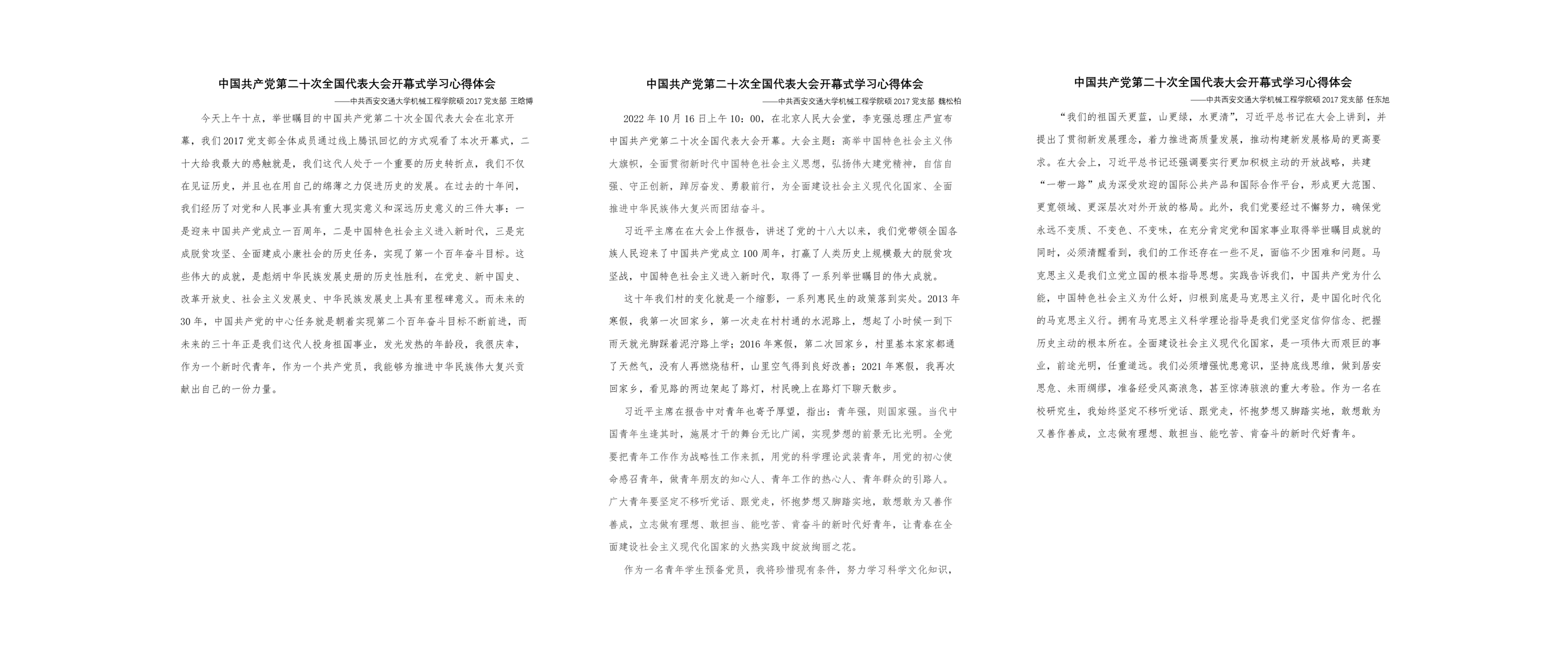 在学习交流后,硕2017党支部的党员同志们积极发挥带头作用,每人将自己观看二十大开幕式和交流总结得到的学习心得以文字的形式进行记录和整理,有助于我支部对二十大的宣传工作。党员同志的学习心得节选如下: