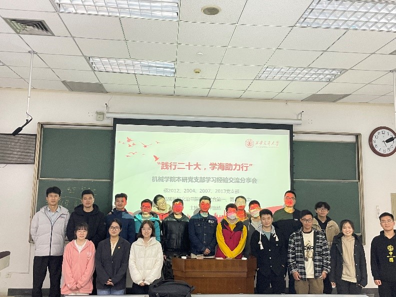 为加强本研支部联系,帮助本科生做好发展规划,提供学习经验,2023年3月18日,硕2012党支部,联合2004、2007、2013党支部与机械学院文治书院师生联合第一、第二党支部共同举办“践行二十大,学海助力行”机械学院本研共建交流会活动,旨在向本科生分享课程学习、竞赛、保研、考研、等学习建议以及加深他们对于机械学院各研究所的了解,硕士生支部21名同学奔赴兴庆校区,与学弟学妹们进行面对面交流。