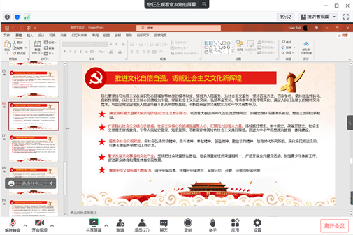 最后,于俨龙同志为大家带来《高举中国特色社会主义旗帜,为全面建设社会主义现代化国家而团结奋斗》主题宣讲。于俨龙同志着眼于党的二十大报告背后的深层问题,深入分析了我党在过去十年的重大政策以及未来的战略部署,以帮助同学们领会二十大报告的精神。通过对重大政策背后的历史逻辑、理论逻辑、实践逻辑的分析,展现了新时代我党重大政策部署的合理性和必然性。