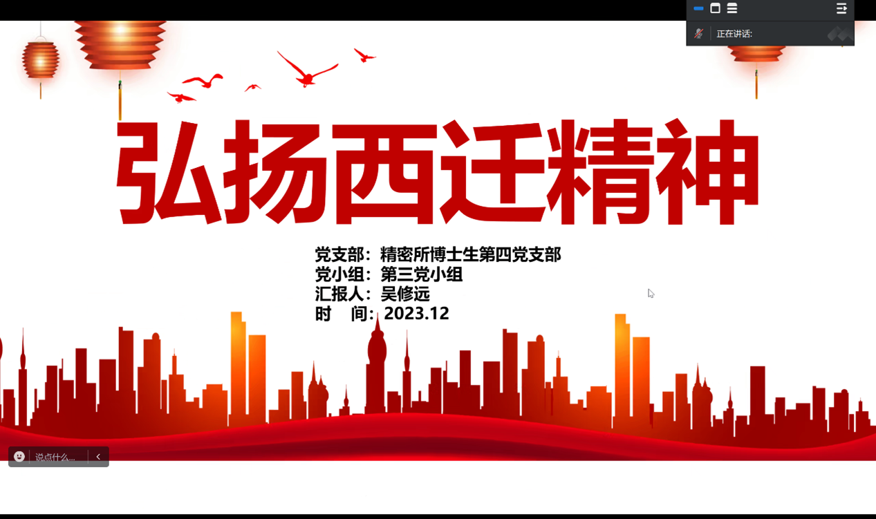 时勉励广大师生,大力弘扬“西迁精神”,抓住新时代新机遇,到祖国最需要的地方建功立业,在新征程上创造属于我们这代人的历史功绩。为深入学习贯彻“西迁精神”,进一步教育引导党员同志不忘初心、牢记使命,精密所博士第四党支部于2023年12月26日通过腾讯会议开展了弘扬“西迁精神”学习教育的主题会议,并进行了本批次党支部预备党员转正工作。本次会议由党支部书记张泽主持,全体党员参与。