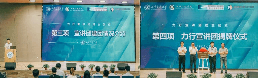 王朝晖、薛周利、苏翔、陈晨共同为力行宣讲团揭牌。陈晨、王朝晖向力行宣讲团负责人杨江坤、机械学院团工委书记苏宇授旗。