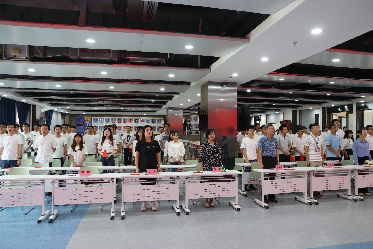 新发展党员面向党旗宣誓,由硕9010党支部的宋林同志领誓。在场全体同志举起右拳庄严宣誓,一字一句,铿锵有力,向党和人民立下自己无悔的誓言。