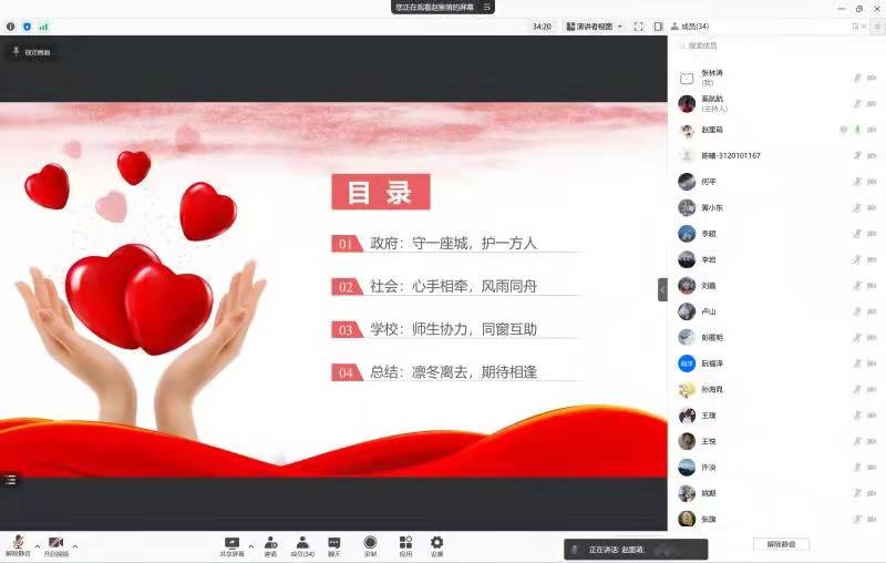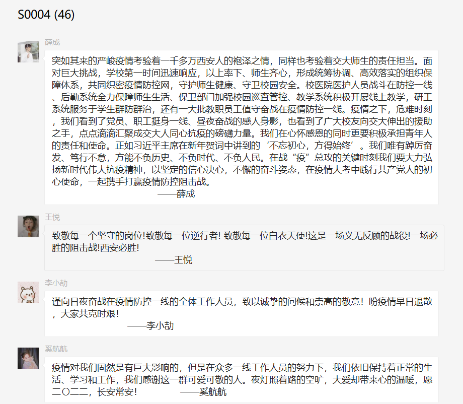 在这场疫情中,无数的抗疫力量涌现出来,共同发力,帮助我们度过难关。赵里萌同学向大家介绍了政府、社会、学校的多方面举措,希望大家能够铭记援助之手,心怀感恩之情。面对变种病毒,政府开展大规模核酸检测,加强重点区域防控,同时调配生活物资,保证民生供应;以市政府、企业和个人为代表的社会力量进行物资捐赠,为西安抗疫汇集力量;校园里,党员干部、辅导员和学生志愿者,各出其力,各展所长,保障师生基本正常生活。没有一个冬天不可逾越,希望我们共同携手,期待春天的到来。朱新凯同学表示,我们要弘扬伟大抗疫精神,增强抗击疫情的精神力量。同时他还赋诗《长安一疫》,表达对各行各业抗疫英雄的感恩之情以及战胜疫情的坚定信心。