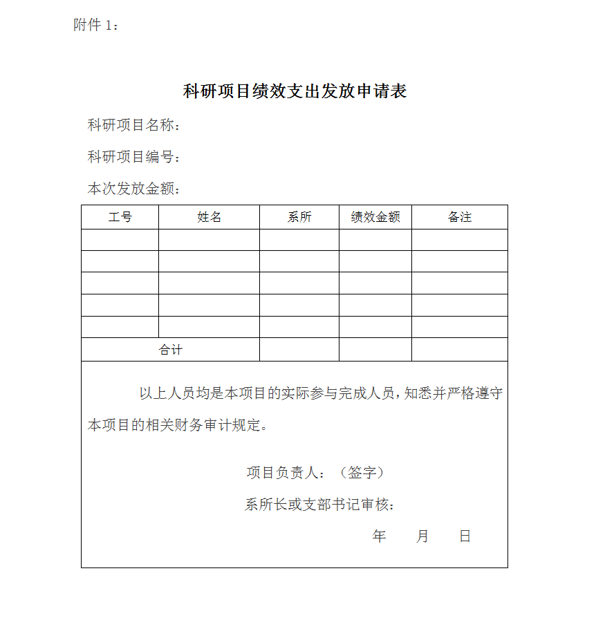 2、科研项目负责人填写《科研项目绩效支出发放申请表》(见附件1),系所长或支部书记审核签字;
